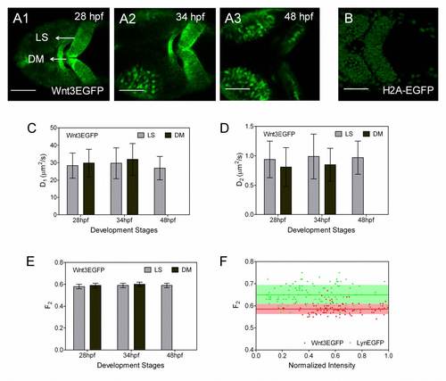 Wnt3EGFP fractions are in a stable equilibrium. (A) Confocal images of zebrafish cerebellum (with optic tectum) expressing Wnt3EGFP at 28 hpf (A1), 34 hpf (A2), 48hpf (A3). The images show that Wnt3EGFP expression level differs in different regions of the cerebellum: lateral side (LS) and dorsal midline (DM). Images were taken in dorsal view. Scale bar, 200 µm. (B) Confocal image of zebrafish cerebellum (with optic tectum) expressing H2A-EGFP at 36 hpf shows that at this stage the nucleus occupies most of the inner space of the cell. Image was taken in dorsal view. Scale bar, 200 µm. (C, D and E) Diffusion coefficients (D1, D2) and fraction of slow moving component (F2) extracted from fit at different development stages and regions in the cerebellum (LS and DM). The expression level in DM at 48 hpf was too low to be measured, therefore only data from LS were acquired. Data are mean ± SD. Light grey bar, LS. Dark grey bar, DM. (F) Fraction of slow moving component (F2) does not change with the protein expressing level, which is indicated by the normalized intensity count rate, for both Wnt3EGFP (red dot) and LynEGFP (green dot). Solid lines represent the mean and areas represent the SD respectively. Abbreviations: Ce: cerebellum; BV: brain ventricle.  |