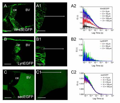 Secreted Wnt3EGFP in the brain ventricle. (A, B, C) Confocal images of zebrafish cerebellum expressing Wnt3EGFP, LynEGFP and secEGFP at 34 hpf. Scale bar, 50 µm. Images were taken in dorsal view. A is the same as Fig. 6A. (A1, B1, C1) Three times zoom in of (A, B, C) with focus on the boundary of the cerebellum and brain ventricle. Scale bar, 20 µm. X-scanning was performed along the white arrow. Data were analysed using ImageJ. Results are shown in Fig. 6C in the main text. (A2, B2, C2) ACF curves of FCS measurements along the arrows at different distance from the cell boundary: 5µm (black); 10µm (red); 50µm (green); 100µm (blue); 150µm (purple). FCS data at 100 µm were normalized and plotted in Fig. 6D in the main text for comparison. Abbreviations: Ce: cerebellum; BV: brain ventricle.  |
