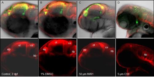Effect of C59 Wnt inhibitor on brain patterning. Exposure of Tg(wnt3:Wnt3EGFP)F2 to C59 Wnt inhibitor suppresses Wnt3EGFP expression and interferes with brain patterning. Dorsal domains of the brain are highlighted by the expression of membrane tethered KillerRed in the epithalamus, optic tectum, cerebellum and hindbrain of Tg (memKR15-8). Double transgenic larvae were treated with 5 µM C59; 50 µM IWR-1 or 1% DMSO from 10 hpf to 48 hpf. Successful interference of Wnt function by C59 results in decreased Wnt3EGFP expression that correlated with defective brain patterning indicated by the absence of epithalamus (ep), optic tectum (ot) and cerebellum (ce) in C59 treated larvae (D).  |
