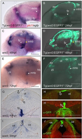 EGFP and Wnt3 expression in transgenics under control of the wnt3 promoter. A stable zebrafish transgenic line containing the 4kb wnt3 promoter drives EGFP expression in a wnt3-like manner with spatio-temporal correlation with endogenous transcripts. (A) egfp transcript expression (purple) in 4kb wnt3 promoter transgenic line Tg(-4.0wnt3:EGFP)F1 colocalized with ptc1 (pink) at the zona limitans intrathalamica (zli) at 24hpf. (B) An in vivo image of 24hpf Tg(-4.0wnt3:EGFP)F1 showing EGFP+ domains highlighted by the transgenic line. (C,E) wnt3 transcripts (purple) are detected in the cerebellum (ce), epithalamus (ep), floor plate (fp), optic tectum (ot), roof plate (rp), midbrain hindbrain boundary (mhb) and hindbrain (hb) of larvae at 48hpf (C) and 72hpf (E). (D,F) In vivo images of Tg(-4.0wnt3:EGFP)F1 at 48hpf (D) and 72hpf (F) showing similar EGFP+ domains. (G-J) Comparison of midbrain (G,H) and cerebellum (I,J) cross sections of wnt3 expression in a 48hpf zebrafish brain (G,I) with corresponding cross sections of Tg(-4.0wnt3:EGFP)F1 (H-J) that detected EGFP expression in similar regions. wnt3-positive domains include the optic tectum, floor plate and cerebellum. Co-immunohistochemical detection of EGFP and Hu-positive neurons showed that EGFP+ domains in the floor plate, floor plate and cerebellum are flanked by neurons (H,H′,J). Scale bars: 100µm.  |