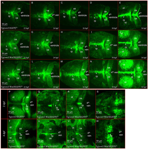 Spatio-temporal expression of wnt3 promoter-driven EGFP/Wnt3EGFP. Spatio-temporal expression of 4kb wnt3 promoter-driven EGFP/Wnt3EGFP influenced by genomic insertion of a transgene varies in strength. Tg(-4.0wnt3:EGFP)F1, Tg(-4.0wnt3:Wnt3EGFP)F1, Tg(-4.0wnt3:Wnt3EGFP)F2 and Tg(-4.0wnt3:Wnt3EGFP)F3 are abbreviated in the figure as Tg(wnt3:EGFP)F1, Tg(wnt3:Wnt3EGFP)F1, Tg(wnt3:Wnt3EGFP)F2 and Tg(wnt3:Wnt3EGFP)F3, respectively. (A-O) Initial spatio-temporal similarity of expression of EGFP and Wnt3EGFP is maintained in three independent transgenic lines. (P-W) Tg(-4.0wnt3:Wnt3EGFP)F3 maintains strong Wnt3EGFP expression in the cerebellum beyond 48hpf. Transgene expression in the optic tectum and cerebellum decreases from 48hpf in all other Wnt3 transgenics. 4th ven, fourth ventricle; ce, cerebellum; ot, optic tectum; rp, roof plate.  |