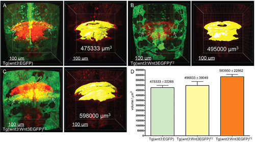 The size of the MHB and cerebellum segmental volume correlates with the level of Wnt3EGFP expression. (A-C) In vivo comparison of segmental volume in Tg(memKR15-16) in EGFP or different Wnt3EGFP transgenics background at 4dpf. Tg(memKR15-16)/EGFP (A), Tg(memKR15-16)/Wnt3EGFP [Tg(wnt3:Wnt3EGFP)F2] (B) and Tg(memKR15-16)/Wnt3EGFP [Tg(wnt3:Wnt3EGFP)F3] (C). KillerRed expression in the MHB and cerebellum of Tg(memKR15-16) is in red; EGFP or Wnt3EGFP expression in wnt3 transgenics is in green; and yellow represents a 3D view of the computed volume. (D) The increase in segmental volume in Tg(memKR15-16) is significant according to unpaired t-test comparing Tg(wnt3:EGFP)F1 vs Tg(wnt3:wnt3EGFP)F3 (P=0.0022). Arrows show expression of EGFP/Wnt3EGFP in the cerebellum.  |