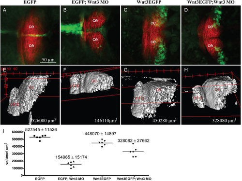 Expression of Wnt3EGFP in the cerebellum of Tg(wnt3:Wnt3EGFP)F3 partially compensates cerebellum growth in MO1-injected Wnt3 morphants. (A-D) Dorsal view of double transgenic Tg(memKR15-16) larvae co-expressing KillerRed with EGFP from Tg(wnt3:EGFP)F1 (A,B) or Wnt3EGFP from Tg(wnt3:Wnt3EGFP)F3 (C,D). KillerRed is expressed in the MHB and cerebellum. Reduction in KillerRed-positive cerebellum is partially compensated in 3dpf Tg(wnt3:Wnt3EGFP)F3 MO1-morphants (D). (E-H) 3D lateral view of KillerRed-positive MHB and cerebellum in Tg(wnt3:EGFP)F1 (E), MO1-injected Tg(wnt3:EGFP)F1 (F), Tg(wnt3:Wnt3EGFP)F3 (G) and MO1-injected Tg(wnt3:Wnt3EGFP)F3 at 3dpf (H). (I) Scatter plot of computed volumes. The decrease in segmental volume in Tg(memKR15-16) is significant between MO1-morphants and un-injected siblings. Unpaired t-test comparing Tg(wnt3:EGFP)F1 vs MO1-morphant Tg(wnt3:EGFP)F1, P<0.0001; Tg(wnt3:wnt3EGFP)F3 vs MO1-morphants Tg(wnt3:Wnt3EGFP)F3, P=0.0034. Segmental volume in MO1-morphant Tg(wnt3:Wnt3EGFP)F3 remains significantly higher than in MO1-morphant Tg(wnt3:EGFP)F1 (P=0.0003). ce, cerebellum; mhb, midbrain hindbrain boundary.  |