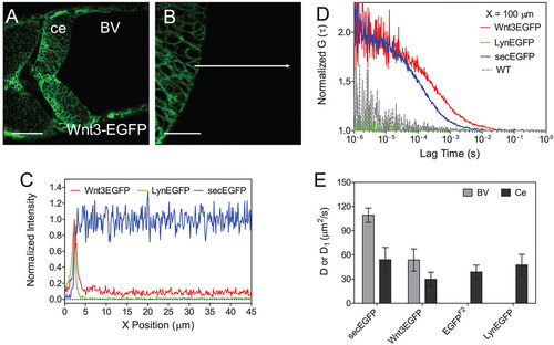 Wnt3EGFP, LynEGFP and secEGFP in the fourth brain ventricle. (A) Confocal image of zebrafish cerebellum expressing Wnt3EGFP at 34hpf. Scale bar: 50µm. (B) Zoom of A at 3× magnification with focus on the cerebellum boundary and flanking brain ventricle. Scale bar: 20µm. Images were taken in dorsal view. BV, brain ventricle; ce, cerebellum. The images were modified using Imaris to increase the contrast. (C) Normalized fluorescence intensity from the cerebellum boundary cell to the brain ventricle along the white arrow in B of Wnt3EGFP (red), LynEGFP (green) and secEGFP (blue). Data are the average of three scans of three embryos for each type to the highest point. (D) Normalized ACF curves taken within a ventricle at 100µm from the cerebellum boundary. Color-coding is the same as in C together with wild type (WT, dotted gray). The results show the free diffusion of Wnt3EGFP and secEGFP in the brain ventricle, whereas no fluorescence can be detected either for LynEGFP or for WT. (E) Diffusion coefficients extracted from fit for different types of EGFP-labeled proteins in both the cerebellum and the brain ventricle. secEGFP serves as an intercellular indicator of protein mobility in multicellular tissue and extracellular indicator in the brain ventricle. EGFP reporter Tg(-4.0wnt3:EGFP)F2 and LynEGFP transgenics Tg(-8.0cldnB:lynEGFP) serve as an indicator of intracellular protein mobility. Data are mean±s.d. Light gray bar, brain ventricle (BV); dark gray bar, cerebellum (ce). See also Fig. S2 and Tables S2, S3.  |
