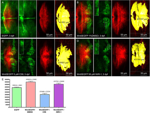 Exposure of Tg(wnt3:Wnt3EGFP)F3 larvae to Wnt inhibitor C59 decreased the segmental volume of cerebellum in Tg(memKR15-16). (A-D) In vivo images of 3dpf double transgenic larvae: control Tg(wnt3:EGFP)F1/Tg(memKR15-16) (A), Tg(wnt3:Wnt3EGFP)F3/Tg(memKR15-16) (B-D). All Tg(wnt3:wnt3EGFP)F3 double transgenic larvae were exposed to either 1% DMSO (B), 5µM C59 (C) or 50µM IWR-1 (D) at 36hpf-stage for 36h before assaying expression of fluorescent reporter at 72hpf. High-magnification view of representative EGFP/Wnt3EGFP-expressing cells from different treatment groups (insets). KillerRed expression in the MHB and cerebellum of Tg(memKR15-16) is in red; EGFP or Wnt3EGFP expression in wnt3 transgenics is in green; and yellow represents a 3D view of the computed volume. (E) Comparison of the resultant KillerRed-positive brain segment in Tg(memKR15-16). A significant difference was observed between segmental volumes in 1% DMSO-treated Tg(wnt3:Wnt3EGFP)F3 vs C59-treated Tg(wnt3:Wnt3EGFP)F3 (unpaired t-test, P=0.0001).  |