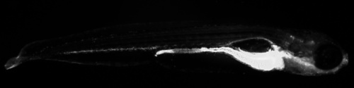 View of larva transgenic for y301Et and Tg(UAS:Kaede)s1999t, which expresses Kaede in medulla oblongata (caudal), retina (photoreceptor layer), intestine, blood, heart (weak) and liver. EXPRESSION / LABELING: