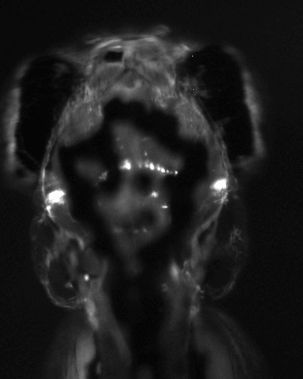 View of larva transgenic for y431Et and Tg(UAS:Kaede)s1999t, which expresses Kaede in integument (patch dorsal to caudal medulla oblongata, second patch on caudal jaw), yolk, retina, muscle and jaw. EXPRESSION / LABELING: