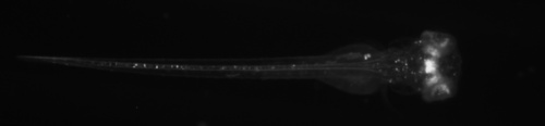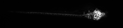 View of larva transgenic for y313Et and Tg(UAS:Kaede)s1999t, which expresses Kaede in posterior tuberculum, Nucleus of the median longitudinal fasciculus, medulla oblongata (caudal), retina and spinal cord. EXPRESSION / LABELING:
