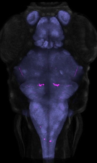 View of larva transgenic for y359Et and Tg(UAS:Kaede)s1999t, which expresses Kaede in medulla oblongata (discrete rostral cluster). EXPRESSION / LABELING: