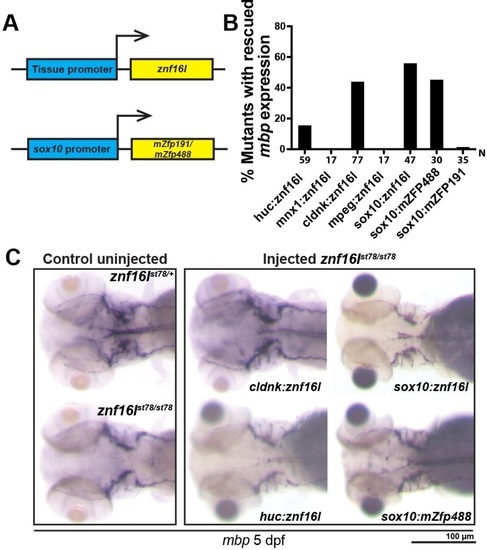 Znf16l functions cell autonomously in the oligodendrocyte lineage. (A) Diagram of the transgenic constructs driving expression of znf16l by tissue-specific gene promoters in neurons (huC), oligodendrocytes (cldnk, sox10) or macrophages (mpeg). Bottom panel shows another transgenic construct strategy to express mammalian zinc finger proteins, mZfp191 and mZfp488, in oligodendrocytes under the control of the sox10 promoter. (B) Plot quantifies the percentage of mbp rescue using different tissue promoters and different zinc finger proteins. (C) Representative images of mbp rescue in cldnk:znf16l-, sox10:znf16l-, huc:znf16l- and sox10:mZfp488-injected znf16l mutants. There is no visible difference in the level of rescues with the different constructs. Genotypes of all fish analyzed were determined by PCR assay. |