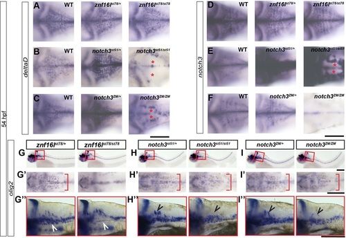 znf16l and notch3 mutants lack distinct populations of OPCs. In situ hybridization of znf16lst78, notch3st51 and notch3ZM embryos at 54hpf for deltaD (A-C), notch3 (D-F), and olig2 (G-I) mRNA expression. (A-F) znf16l homozygous mutants do not exhibit decreased deltaD (A) or notch3 (D) expression seen in notch3 homozygous mutants (asterisks in B,C,E). (G′-I′) znf16l mutants exhibit a delay in lateral migration of OPCs (red brackets in G′) that is not seen in either notch3 mutant (H′,I′). (G-I,G′′-I′′) Lateral view of the hindbrain shows that znf16l mutants are mostly lacking the ventral OPC population (white arrowheads), whereas notch3 mutants are mostly lacking the dorsal OPC population (black arrowheads). Genotypes of all fish analyzed were determined by PCR assay. Scale bars: 100µm. |