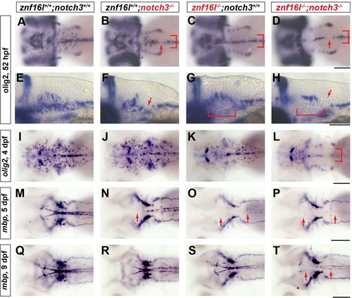 Severe defects in oligodendrocyte development in mutants lacking function of Znf16l and Notch3. In situ hybridization analyses of oligodendrocyte development and myelination in mutants lacking Notch3, Znf16l, or both. (A,E,I,M,Q) Wild-type oligodendrocyte precursors migrating laterally can be detected at 52hpf (A), and strong expression of mbp can be detected at 5dpf (M) continuing to 9dpf (Q). (B,F,J,N,R) notch3 mutants (st51) exhibit reduced lateral migration of OPCs at 52hpf and gaps in olig2 expression (red arrows in B,F and bracket in B). The number and distribution of OPCs recovers by 4dpf (J), although mbp expression is still reduced strongly in hindbrain of notch3 mutants (N). (R) By 9dpf mbp expression recovers, but remains distinguishably reduced compared with wild type. (C,G,K,O,S) znf16l single mutants (st97) show reduction of OPCs at an early stage (bracket in C,G) and a lack of mbp at 5dpf that recovers by 9dpf as shown before (O and S). (D,H,L,P,T) Mutants lacking both Znf16l and Notch3 have a more severe phenotype than either single mutant. Numbers of OPCs are strongly reduced and no OPCs migrate laterally similar to the znf16l mutant at 52hpf (red arrows and bracket in D,H). Numbers of OPCs are still reduced by 4dpf (L). mbp expression in double mutants is strongly reduced at 5dpf (P) and very slight expression is observed by 9dpf (T) compared with either single mutant (R and S). Genotypes of all fish analyzed were determined by PCR assay. Scale bars: 50µm. |