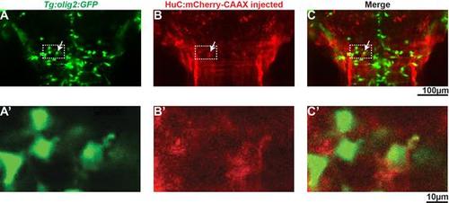huC regulatory sequences drive expression in some OPCs. Tg:olig2:GFP stably transgenic embryos were injected with a construct encoding huC:mCherry-CAAX, which labeled cells expressing huC regulatory sequences with membrane-tethered mCherry (B, red). (A-C) Representative embryo showing (A) GFP in oligodendrocytes and motor neurons, (B) membrane tethered mCherry, and (C) merged image. OPCs and motor neurons were distinguished by morphology and position. In 3 of 38 injected embryos, some OPCs co-expressed GFP and membrane-tethered mCherry (arrow), indicating that the HuC construct may be expressed in a subset of cells of the oligodendrocyte lineage. (A′-C′) These images show magnified views of boxed regions in A-C. |