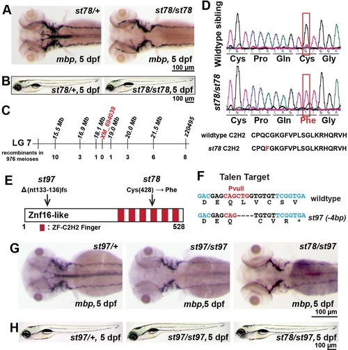 Mutations in znf16-like reduce mbp mRNA expression in the CNS. (A) At 5dpf, expression of mbp was specifically reduced in the CNS but not the PNS of st78 homozygote compared with the heterozygous sibling. (B) st78 mutant had normal gross morphology at 5dpf compared with the wild-type sibling. (C) Genetic mapping linked st78 locus to XM_694039 in linkage group 7. (D) Sequence chromatogram shows the lesion (red box) in the coding sequence of znf16-like (XM_694039). The point mutation in st78 changes a cysteine in a Cys2His2 zinc finger of Znf16l to a phenylalanine. (E) Schematic diagram depicting Znf16-like protein with all its zinc fingers, the location of the transversion in the st78 allele, and the 4bp deletion resulting in a frameshift in the st97 allele. (F) Nucleotide sequence of znf16l and the TALE nuclease targeted sequence (black) and diagnostic restriction enzyme site (red). Bottom line shows the st97 allele and the corresponding amino acid sequence resulting from the frameshift. (G) At 5dpf, expression of mbp was reduced in the CNS of st97 homozygote in comparison to the heterozygous sibling. st97 failed to complement st78, and the transheterozygous mutant lacked mbp in the CNS, similar to the homozygous mutants. The genotypes of all larvae shown in A,B,G,H were determined by PCR tests for their respective lesions. |