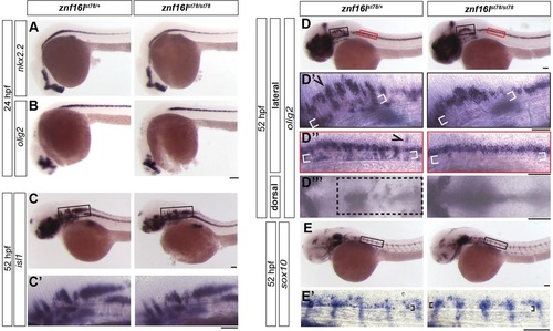 Developmental disruptions in znf16l mutants are specific to the oligodendrocyte lineage. (A,B) znf16l mutants displayed normal expression of nkx2.2 (A) and olig2 (B) at 24hpf. (C,C2) znf16l mutants also displayed normal expression of the motoneuron marker islet1 at 52hpf. (D,E) Defects in znf16l mutants were specific to cells in the oligodendrocyte lineage. (D-D4) olig2 is expressed by oligodendrocyte-lineage cells and a subset of motoneurons. The expression pattern of olig2 in wild-type siblings revealed groups of cells that had migrated dorsally (arrowhead), ventrally (white brackets) and laterally (box). These cell populations are missing or reduced in the mutants. D2 and D3 show regions in black and red boxes, respectively, in D. (E) sox10 expression is restricted to cells of the oligodendrocyte lineage in the CNS. Wild-type siblings displayed a group of cells (brackets in E2) immediately dorsal to the notochord that were missing in the mutants, confirming the disruption of oligodendrocyte-lineage cells in znf16l mutants. The genotypes of all embryos shown were determined by PCR tests for the st78 lesion. Scale bars: 100µm. |