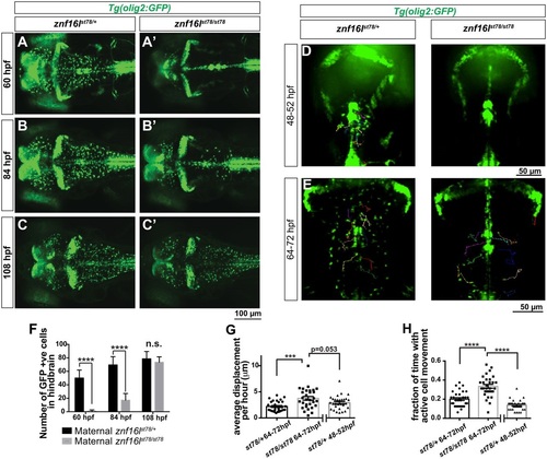 Disruption of OPC migration in znf16l mutants. (A-C) znf16lst78 mutants and wild-type siblings in Tg(olig2:GFP) background. The number of OPCs is greatly reduced in the mutants at 60hpf (A,A2) and 84hpf (B,B2), but recovers quickly by 108hpf (C,C2). (D,E) Dorsal view of time-lapse imaging from 48-52 and 64-72hpf, with trajectories of 10 individual OPCs as they migrated laterally out of the midline, shown using the MTrackJ cell-tracking tool (n=3 fish per genotype, per time point). Cells were tracked every 15min in real time (see Movies 1-4 for time-lapse images). Genotypes of all embryos were determined by PCR after imaging. (F) Quantification of the number of GFP-expressing cells in the hindbrain of Tg(olig2:GFP) znf16lst78 mutants and wild-type siblings (n=15 wild type, n=9 mutant). The numbers were significantly different at 60 and 84hpf, but not at 108hpf (two-tailed Student′s t-test, ****P<0.0001). (G) Quantification of average OPC displacement (µm) per hour of 30 tracked cells from each timepoint. Mutant OPCs traveled farther than wild-type siblings. (H) Quantification of the fraction of time for which each OPC was actively moving. Mutant OPCs spent more time moving compared with wild-type siblings at either stage. Error bars show s.e.m. significance with one-way ANOVA and post hoc comparisons. ***P=0.0003 in G; ****P<0.0001 in H. |