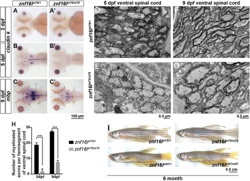CNS myelin is reduced in znf16l mutants. (A-C) Expression of mature oligodendrocyte markers claudin k (A,B) and mbp (C) was reduced in znf16lst78 mutants between 3 and 9dpf. Expression of cldnk was reduced but detectable at 5dpf (B), and expression of mbp was reduced but detectable at 9dpf (C). (D,E) Transverse transmission electron microscopy images of ventral spinal cord showed that many wild-type axons were already myelinated in wild type (D) but not mutants (E). (F,G) At 9dpf, more axons were myelinated in the mutants (G) than at 5dpf, but the number was still much less than in wild-type siblings at 9dpf (F). (H) Quantification of the number of myelinated axons in ventral spinal cord at 5 and 9dpf. Error bars show s.d.; significance was determined with two-tailed Student′s t-test. ***P<0.001 in H. (I) Adult znf16l homozygous mutants are viable and fertile, with no gross morphological defects compared with their wild-type siblings for both of the alleles. Genotypes of all fish analyzed were determined by PCR assay. |
