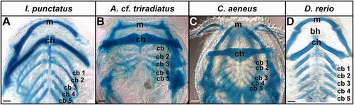 Pharyngeal arches develop later in catfish than in zebrafish. Chondrification of jaw (mandibular arch), hyoid arch, and branchial arches as detected by Alcian Blue staining. Images show lower branchial elements in ventral view. (A) Ictalurus punctatus, 96 hpf; (B) Ancistrus cf. triradiatus, 96 hpf; (C) Corydoras aeneus, 102 hpf; (D) Danio rerio, 72 hpf. m, Meckel’s cartilage; bh, basihyal; ch, ceratohyal cartilage; cb, ceratobranchial cartilages. Scale bars = 100 µm.  |