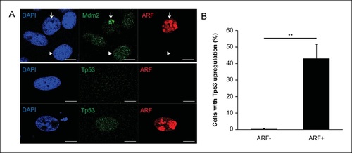 Analysis of ARF expression in zebrafish cells. (A) Immunofluorescence for Mdm2 and ARF (top) and Tp53 (bottom) in zebrafish cells (ZKS) transfected with pcDNA-ARF. ARF and Mdm2 co-localize in the nucleolus (arrow) when ARF is expressed; in cells without ARF, Mdm2 has a diffuse nuclear staining pattern (arrow head; top). Tp53 upregulation depends on ARF expression (bottom). Scale bars: 10 µm. (B) Quantification of Tp53 upregulation in zebrafish cells (ZKS) transfected with pcDNA-ARF (N = 100, p<0.01). Results are shown as mean ± standard deviation. |