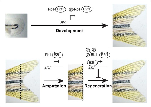 Model of ARF function in the context of Rb pathway activity during zebrafish development and fin regeneration.ARF is not active during development during which a moderate level of mitogenic signaling causes modest phosphorylation of Rb1 (top); however, during regeneration, high mitogenic signaling induces Rb1 hyperphosphorylation and abundant free E2f1, which activates ARF and leads to inhibition of regeneration (bottom). The dashed lines represent the amputation plane. |