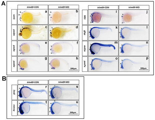 Expression of brain region specific markers detected byin situhybridization. Detection of the expression ofotx2 (marker of forebrain and MHB), eng2a (marker for MHB and hindbrain), egr2b (marker for MHB and hindbrain), and fgf8a (marker for forebrain and MHB) after loss oftrim69 by in situ hybridization.trim69-CON: control group; trim69-MO: trim69 knocking down; black arrow indicates positive signals; scale bar: 200µm. |