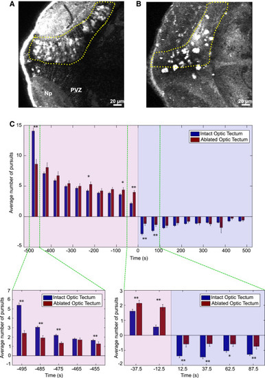 Ablation of the Optic Tectum Impairs the Generation of MAE (A) An optical plane of the HuC:GCaMP5 zebrafish tectum after two-photon laser ablation. For visualization purposes, ablation of a single tectal hemisphere is shown. For the experiments, both hemispheres were ablated. Note the large increase in fluorescence of the ablated neurons with respect to the intact hemisphere. (B) As in (A), but after labeling with acridine orange to label apoptotic neurons. The labeling was performed immediately after the behavioral experiments (1 day after the ablation). (C) Top: summary of the behavioral experiments after tectal ablations. The chart shows the average number of pursuits during the CS and the post-CS periods. Pink background, CS period; violet background, post-CS control period; blue bars, control (intact optic tectum); red bars, ablated optic tectum; positive values, pursuits in the direction of the CS; negative values, pursuits in the MAE direction. Asterisks mark significant differences (∗p < 0.05, ∗∗p < 0.01, Kruskal-Wallis; n = 26 trials from 4 larvae). Error bars, SE. Bottom: expanded timescale of the indicated regions above (green dashed lines). Note the weak initial behavioral response to the CS in ablated larvae and the much weaker optokinetic MAE-like behavior in ablated larvae compared to intact larvae. |