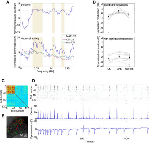 Frequency Analysis and Topography of MAE-Associated Neurons (A) Top: normalized power spectrum of eye movements during MAE-like behavior. Bottom: normalized power spectrum of neuronal data during MAE-like behavior. Violet, MAE direction-selective neurons; pink, CS direction-selective neurons; green, non-direction-selective neurons; yellow patches, significant behavioral frequencies (normalized power spectrum exceeds a threshold set at zero, dashed gray line). (B) Top: normalized averaged frequency power of behaviorally relevant significant frequencies, during post-CS control period. Gray lines, the individual experiments for the CS, MAE, and non-direction-selective neurons; black line, the mean power value. CS direction-selective modulation = −0.71 ± 0.13 dB, MAE direction-selective modulation = 0.15 ± 0.16 dB, and non-direction-selective modulation = −0.11 ± 0.14 dB (p = 4.1 × 10−5 for CS and MAE direction-selective neurons, p = 2.9 × 10−4 for non-direction-selective and MAE direction-selective neurons, p = 0.04 for CS and non-direction-selective neurons, Wilcoxon rank sum test). Bottom: as for top, but for non-significant non-behaviorally relevant frequencies. CS direction-selective modulation = −2.3 ± 0.7 dB, MAE direction-selective modulation = −1.96 ± 0.72 dB, and non-direction-selective modulation = −2.19 ± 0.75 dB (p = 0.34 for CS and MAE direction-selective neurons, p = 0.49 for non-direction-selective and MAE direction-selective neurons, p = 0.6 for CS and non-direction-selective neurons, Wilcoxon rank sum test). In both cases, error bars, SE. n = 9 trials from 8 larvae. (C) Pairwise correlation matrix of MAE direction-selective neuronal activity during the post-CS period. The matrix was ordered according to k-means clustering. The color-scale bar shows the level of correlation. (D) Top: raster plot of MAE direction-selective neurons during the post-CS control period ordered according to (A). Middle: sum of calcium activity. Bottom: eye orientation. About 30% of the neurons show synchronous Ca2+ transients associated with all eye pursuits in the MAE direction. (E) Topography of the MAE direction-selective neurons. Green, neurons correlated with the pursuits in the direction of MAE; red, non-correlated neurons. |