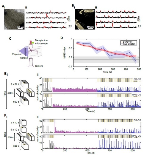 Calcium-imaging-data-processing methods and experimental protocols (related to Figure 4). (A) i. An optical section of the zebrafish larva’s optic tectum superimposed with the ROIs corresponding to each single neurons (yellow patches). ii. Examples of typical single-neuron DF/F traces (black) with significant fluorescence transients highlighted in red. Breaks in the traces depict discarded frames due to movement artifacts. (B) i. An optical section of the optic tectum of an ath5:GCaMP3 zebrafish larva, where the tectal neuropil can be clearly observed. The SROIs are superimposed to the image (yellow patches). ii. Examples of typical single-SROIs DF/F traces (black) with significant fluorescence transients highlighted in red. Breaks in the traces depict discarded frames due to movement artifacts. (C) Experimental setup: Scheme of the two-photon system for simultaneously monitoring eye movements and presenting visual stimuli. (D) MAE index as a function of time after CS under the two photon microscope. Blue curve: MAE index as a function of time under a two-photon microscope. CS consisted in repetitive moving bars for 500 s. Red curve: MAE index as a function of time as showed in Fig. 1F. CS consisted in whole field grating for 500 s. Gray line represents the control index for the two-photon experiments. Nonsignificant differences where found between the two conditions. Error bars: s.e. For repetitive moving bars, n=20 (trials), from 10 larvae. For whole field grating, n=15 (trials), from 15 larvae. (E) i. Experimental paradigm for monitoring adaptation of RGC projections in paralyzed larvae. ii. The sum of the relative change in fluorescence intensity (DF/F) of direction selective SROIs as a function of time. Top panel, CS direction selective SROIs. Bottom panel, MAE direction selective SROIs. The color bars represent the different stimulation blocks of the experimental paradigm: gray for pre-CS control, magenta for CS and blue post-CS control period. Top bars: depict the presentation period of each moving bar (gray: CS direction, yellow: MAE direction). (F) As in E, but for tectal neuron recordings. |