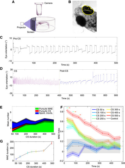 Zebrafish Larvae Perceive the MAE (A) Experimental setup. Stimuli were projected on a screen around the larva immobilized in agarose. The agarose was then removed around the eyes, and their rotations were recorded from above using an objective, a tube lens, and a video camera. (B) Detection of eye orientation. The original image was thresholded and converted to binary to detect the eyes. Yellow, the eye outline and the long and short axes of the fitted ellipse; gray dashed line, external axis. The orientation of the eyes was calculated with respect to the external horizontal axis. (C) Stereotypic spontaneous eye rotations in the absence of visual stimuli. Saccades in one direction are followed by a fixation period and a saccade in the opposite direction. (D) Eye rotations during CS and during the post-CS control period. Note the pursuit movements induced by the CS (magenta) and the pursuits in the opposite direction during the post-CS control period (blue), reminiscent of optokinetic MAE-like behavior. The latter gradually decreased in frequency until the stereotypical spontaneous eye movements were restored around 250 s. Mean eye velocity during the last 200 s of CS was 1.50°/s ± 0.03°/s, and eye velocity during optokinetic MAE-like behavior was 0.8°/s ± 0.03°/s (p = 1.6 × 10−54, Wilcoxon rank sum test). Eye amplitude during CS was 13.7° ± 0.2°, and eye amplitude during optokinetic MAE-like behavior was 7.0° ± 0.1° (p = 1.03 × 10−4, Wilcoxon rank sum test; n = 40 trials from 11 larvae for CS durations 500 s. (E) Ratio of the different types of movements during the first 50 s of the post-CS control period as a function of the CS duration (n = 36, 36, 39, 34, 36, 34, and 40 trials from 10, 9, 10, 10, 10, 9, and 11 larvae for CS durations of 50, 100, 200, 250, 300, 400, and 500 s, respectively). In all cases, the CS velocity was 26°/s. Green, pursuits in the MAE direction; red, pursuits in the CS direction; blue, spontaneous eye movements; gray shade, SE. (F) Mean MAE index as a function of time during the post-CS control period. The curves are color coded according to the CS durations (top right legend). The gray dash line represents the control index. The asterisk indicates significantly different from control (p < 0.01, Kruskal-Wallis), color coded according to the corresponding colors. Error bars, SE. (G) The average duration of optokinetic MAE-like behavior as a function of CS duration. The colors depict the duration of the CS as in (F). For (F) and (G), n = 120, 104, 117, 110, 114, 112, and 97 trials from 20, 19, 20, 19, 19, 19, and 17 larvae for CS durations of 50, 100, 200, 250, 300, 400, and 500 s, respectively. Control is n = 14 trials from 14 larvae. Error bars, SE. |