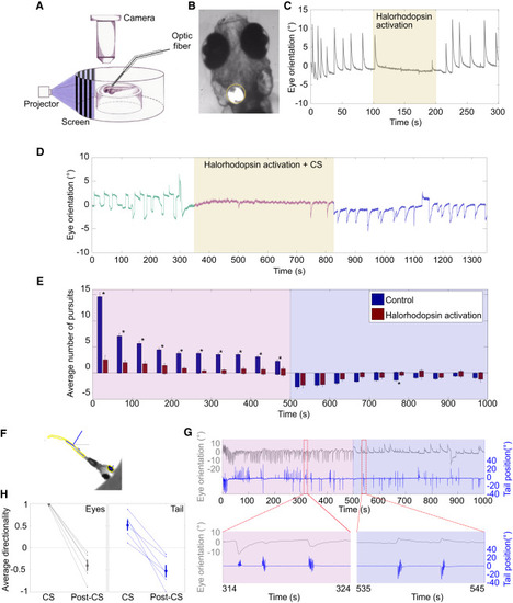 MAE Is Generated in a Sensory Brain Region (A) Experimental setup used to block eye movements during the presentation of MAE. Eye movements were recorded as in Figure 1A. To inhibit eye movements, we used transgenic larvae pan-neuronally expressing NpHR and a 105 μm optic fiber coupled to a 565 nm LED mounted on a micromanipulator. (B) Image of larva obtained using the setup in (A). In all experiments, the fiber was positioned orthogonally and unilaterally above rhombomere 5. The yellow circle shows the illuminated zone. (C) Example of optogenetic inhibition of OKR during the presentation of CS, with eye orientation as a function of time. The CS was presented during the entire 300 s period. The yellow patch represents the illumination period. Note the drastic and rapid inhibition of the eye movement upon halorhodopsin activation. (D) Example showing that optogenetic inhibition of eye movements during the presentation of CS did not perturb MAE; eye orientation as a function of time during CS. Green curve, pre-CS; pink curve, CS; blue curve, post-CS; yellow patch, NpHR activation period. (E) The average number of pursuits during the CS and the post-CS periods, summarizing all experiments as in (D). Pink background, CS period; violet background, post-CS control period; blue bars, control (LED off during CS); red bars, LED on during CS; positive values, pursuits in the direction of the CS; negative values, pursuits in the MAE direction. Asterisks mark significant differences (p < 0.01, Kruskal-Wallis; n = 9 trials from 9 larvae). Error bars, SE. (F) Detection of eye and tail orientation. The image of the larva superimposed with the automatic detection of the tail and eyes. The orientations were calculated with respect to the external horizontal axis (gray dashed lines). (G) Optomotor MAE-like behavior. Top: eye and tail orientations during CS (pink background) and post-CS (magenta background). Bottom: expanded timescale of the indicated regions above (red dashed rectangles). Note the inversion of the directionality of both eye and tail movements during the post-CS period with respect to the CS period. (H) Summary of all experiments as in (G). The average directionality of the eye pursuits (gray) and tail bouts (blue) during CS and post-CS periods (n = 6 trials from 6 larvae). To compute the directionality, we classified each pursuit and each tail bout as moving in the direction of the CS or in the opposite one. Movements performed in the direction of the CS were given the value 1, and movements in the opposite direction were given the value −1. For each experiment, we calculated the average across movements. Large gray dots represent the population average. Error bars, SE. For all experiments, average directionality of both eye pursuits and tail bouts was inverted. |