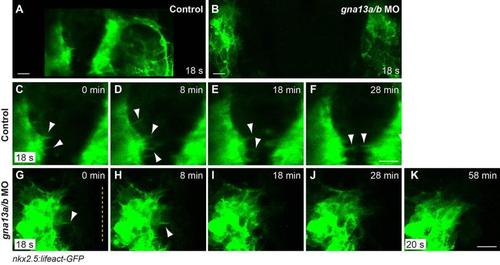 Myocardial precursors form robust migratory protrusions, which are transient in Gα13-deficient embryos. Snapshots from confocal movies of control and gna13a/b MO-injected Tg(nkx2.5:lifeact-GFP) embryos (supplementary movie 3). (A,B) The myocardial cells at 18s when the time-lapse started. (C-K) Magnified images in A-B at the indicated time-points. (C-F) The most dorsal regions of two myocardial populations in control embryos. (G-K) The left side of myocardial populations in morphants. The protrusions were presented initially, but disappeared in morphants. White arrowheads: protrusions. Yellow dashed line: midline. Scale bars: 20 μm. |
