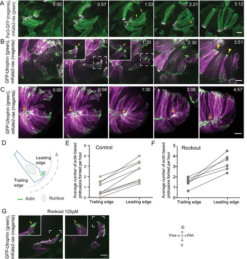 Rim involution involves active cell migration of connected epithelial cells. (A) Time-lapse imaging of rim zone with mosaic expression of Par3-GFP and mKate2-ras. Arrows show membrane protrusions. Frames from Video 4. N = 5. (B) Time-lapse imaging of rim zone with mosaic expression of GFP-UtrophinCH and ras-mKate2. Inlays show zoomed marked area. Arrows show actin localization in the protrusions. Arrowheads mark the basally enriched stable actin pool in the RNE. Frames from Video 5. N = 6. (C) Time-lapse imaging of rim zone with mosaic expression of GFP-UtrophinCH and ras-mKate2. Yellow arrows show apical actin localization at adherens junctions. Frames from Video 7. N = 6. (D) Schematic of a rim cell exhibiting actin based protrusions at the basal side. The arrow marks the direction of involution. The leading and lagging edges indicate the sides referred in (E) and (F). (E) Number of actin protrusions observed per hour in rim cells in the control condition. Each pair of datapoints represents two sides of the same rim cell. n = 9, N = 6 . See Figure 3—source data 1. (F) Number of actin protrusions observed per hour in the rim cells in Rockout treatment condition. Each pair of datapoints represents two sides of the same rim cell. n = 6, N = 6. See Figure 3—source data 1. (G) Confocal scan of rim zone in Rockout-treated embryos with mosaic expression of GFP-UtrophinCH and ras-mKate2. Inlays show enlarged marked area. Arrows show actin localization in the protrusions. Frames from Video 6. N = 6 all scale bars = 10 µm. All movies started around 17 ss -18 ss, Time in h:min. |