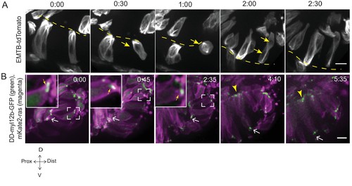 Microtubule and myosin dynamics during rim involution. (A) Time-lapse imaging of rim zone with mosaic expression of EMTB-tdTomato.Arrows mark the cell dividing during rim involution. Dashed line marks the apical side. Imaging started at 17–18 ss. N = 4. (B) Time-lapse imaging of rim zone with mosaic expression of DD-myl12b-GFP and mKate2-ras. Inlays show zoomed marked area. Yellow arrows indicate basal myosin punctae in the rim cells. White arrows mark adherens junctions. Arrowheads mark basally enriched stable myosin pool in the RNE. Frames from Video 9. Imaging started at 15–16 ss. N = 5. Scale bars = 10 µm, Time h:min. |