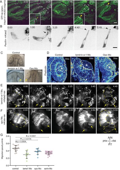 Dynamics of ECM distribution and cell-ECM attachment during RNE morphogenesis. (A) Confocal scans of immunostainings for laminin (middle) and chondroitin sulfate (bottom) in GFP-ras (top) expressing embryos across different stages of RNE morphogenesis. (B) Confocal scans of immunostainings for Fibronectin (top) and phalloidin across different stages of RNE morphogenesis. Merge (bottom). (C) Time-lapse imaging of RNE morphogenesis in embryos expressing Paxillin-mKate2 and GFP-UtrophinCH. Arrowheads point at paxillin enrichment coinciding with UtrophinCH enrichment. Frames are from Video 12. Imaging started at 15 ss. Time h:min. All scale bars = 10 µm. |