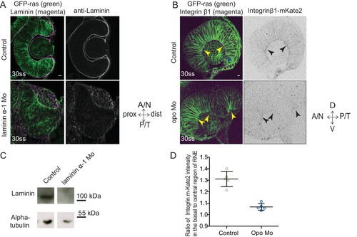 Evaluation of the efficiency of morpholino mediated knockdown of laminin α-1and opo. (A) Confocal scan of 30 ss RNE in control (top) and laminin morphants (bottom) marked with GFP-ras stained for laminin. Morphant shows S-shaped RNE and reduced laminin staining. Scale bar = 10 µm. (B) Confocal scan of side view of 30 ss RNE in GFP-ras and Integrin-β1-mKate2 RNA injected control (top) and opo morphant (bottom) embryo. Morphant shows S-shaped RNE with secondary invagination zone and highly reduced basal localization of integrin. N = 5. Scale bar = 10 µm. (C) Western blot for laminin and alpha-tubulin in control and laminin morphant. (D) Ratio of average integrin β1-mKate2 signal at the basal to central region in the RNE in optical section along the apicobasal axis of the RNE at 30 ss. Mean ± SD, N = 5 embryos. See Figure 4—source data 1. |