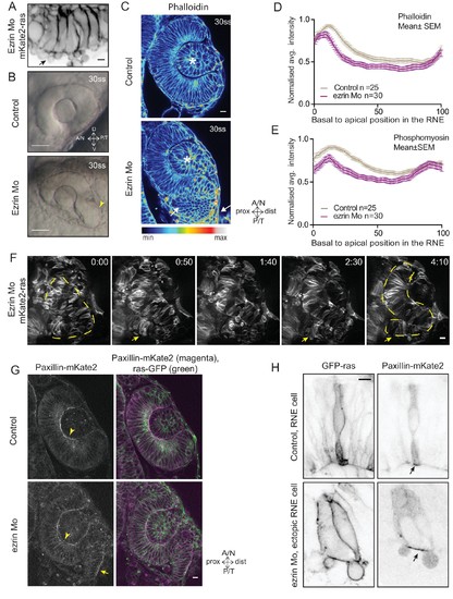 Analysis of ezrin morphant condition. (A) Western blot for p-ERM and alpha tubulin in control and ezrin morphant. (B) Brightfield image of Ezrin morphant embryo at 30 ss stage. (C) Confocal scan of 30 ss RNE in control (left), ezrin morphant (right) stained for aPKC. Morphant shows S-shaped RNE. N = 5. Scale bar = 10 µm. (D) Confocal scan of rim zone showing GFP-ras expressing ezrin morphant clone in a control embryo. N = 2 out of 4 transplanted embryos. Blue arrows point at the basal blebs exhibited by the transplanted morphants cells. Scale bar = 5 µm. (E) Instantaneous slope of the average intensity curves for phalloidin plotted for the basal 20% height of the neuroepithelial volume. The position on the X-axis marks the position along the apicobasal axis. The analysis was performed using the data from Figures 1F, 2C and 5D and Figure 4—figure supplement 3C,D. See Figure 5—source data 3. |