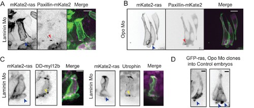 Effect of perturbed cell-ECM attachment on the rim cells. (A) Confocal scan of rim cell in laminin morphant embryos with mosaic expression of mKate2-ras and paxillin-mKate2. Blue arrowhead points at the bleb. Red arrowhead marks at the stable paxillin localization. Frames from Video 15. N = 3. Scale bar = 10 µm. (B) Confocal scan of rim cell in opo morphant embryos with mosaic expression of mKate2-ras and paxillin-mKate2. Blue arrowhead points at the bleb. Red arrowhead marks at the transient paxillin localization. Frames from Video 16. N = 3. Scale bar = 10 µm. (C) Confocal scan of rim cells exhibiting blebs (blue arrowhead) in laminin morphants mosaically labeled by mKate2-ras with DD-myl12b-GFP (left) and GFP-UtrophinCH (right). Yellow arrowhead marks the localization of DD-myl12b-GFP outside and UtrophinCH inside the bleb. Scale bar = 2 µm. (D) Confocal scans of rim zone showing GFP-ras expressing opo morphant clone in control embryos. N = 4 out of 5 transplanted embryos. Blue arrow points at the basal blebs exhibited by the transplanted morphants cells. Scale bar = 5 µm. |