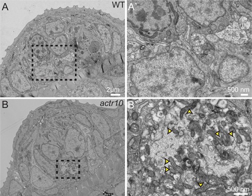 TEM analysis of axon terminal swellings reveal mitochondrial accumulation. (A) Wild-type axon terminals innervating lateral line neuromasts showed no swellings (N = 3). (B) All neuromasts assayed in actr10 mutants had mitochondrial laden axon terminal swellings (N = 4). A` and B` are higher magnification views of the areas outlined in A and B. Arrowheads in B` point to mitochondria. |