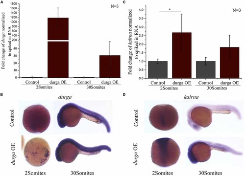 Over-expression of durga enhances kalrna expression. In vitro transcribed durga was injected in one cell stage of zebrafish embryo and over-expression was confirmed by qPCR (A) and in situ hybridization (B) at 2Somites and 30Somites stages. Increase in kalrna expression was seen in qPCR (C) and in situ hybridization (D) at 2Somites and 30Somites stages. Data represent three independent experiments. p-value was calculated using Student’s t-test. *p ≤ 0.05. OE denotes overexpression. N is number of biological replicates. |