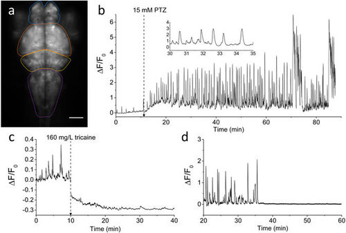 Brain activity recording with GCaMP6s. (a) Fluorescence image of the encephalon of a 4 dpf larva expressing GCaMP6s under elavl3 promoter. Scale bar: 100 µm. The four main zebrafish brain regions used for further analysis in the paper are highlighted (Telencephalon, blue; Optic tectum, orange; Cerebellum, yellow; Medulla, purple). (b) Time trace of fluorescence (ΔF/F0, see Methods for detail) in control conditions and after addition of 15 mM PTZ (at the time indicated). The fluorescence data are integrated over the whole brain of the larva and sampled at 5 Hz. The inset shows a shorter time interval of the trace to better display calcium peak shape and regularity. (c) ΔF/F0 trace of an experiment in which tricaine (160 mg/L) was added at the time indicated and the subsequent decay of activity was monitored. The ΔF/F0 values become negative after tricaine addition since the F0 reference level was measured in control conditions (see Methods for details). (d) ΔF/F0 trace showing sharp brain activity decay in a larva simultaneously treated with 15 mM PTZ and 5 μM TTX. After approximately 35 min upon drugs application, TTX action totally suppressed neuronal seizure activity induced by PTZ. |