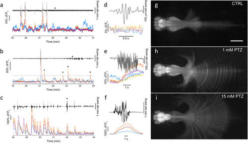 Simultaneous measurement of brain activity and tail movement. (a) Time trace of tail movement (black line) and fluorescence (ΔF/F0) analysed in control conditions (0 mM PTZ) for four brain regions color-coded as in Fig. 1a. The traces show correlations between fluorescence peaks and tail movements for optic tectum, cerebellum and medulla, while the telencephalon exhibits some degree of activity not correlated with tail movement. (b-c) Tail movement and brain activity analysed as in panel a at 1 and 15 mM PTZ, respectively. The dashed lines show a ΔF/F0 level of 0.4 corresponding to the highest peaks typically measured in control conditions. The arrowheads in panel b highlight peaks overcoming the 0.4 level and not corresponding to large tail movements. (d-e-f) Expanded time scale traces of the fragment indicated by the asterisk in a, b and c, respectively. Each panel shows movement and fluorescence traces (color-coded as in panels a-c) corresponding to a typical tail movement observed in the corresponding condition. (g-h-i) Fluorescence images of head-restrained larvae (see Methods) in 0, 1 and 15 mM PTZ. Images are maximum intensity projections over a time interval of 10 min, chosen during typical locomotor activity of the tested condition. Panels h and i are displayed with gamma = 0.4 to avoid saturation in the encephalon and still have good contrast on the tail. Scale bar 500 µm. PHENOTYPE: