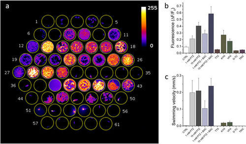 High-throughput combined fluorescence and behavioural assay. (a) Maximum intensity projection of a 13 minute segment of the recording. Well content: 1–6 control, 7–12 1 mM PTZ, 13–18 15 mM PTZ, 19–24 1 mM PTZ + 50 μM Baclofen, 25–30 15 mM PTZ + 50 μM Baclofen, 31–36 15 mM PTZ + 5 μM Tetrodotoxin, 37 fish water, 38 fish water + 2 mM Kynurenate, 39–43 15 mM PTZ + 2 mM kynurenate, 44–49 15 mM PTZ + 5 mM Valproate, 50–55 15 mM PTZ (after pre-incubation in 2 mM d-tubocurarine for 10 minutes before starting the measurement), 56–61 15 mM PTZ + 160 mg/L Tricaine. (b) Average ΔF/F0 and (c) swimming velocity for the different conditions tested. Error bars: s.e.m. |