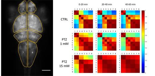 Cross-correlation maps of activity in different brain regions. Left. Regions of interest selected for analysis are shown overlaid with the fluorescence image; scale bar 100 μm. Right. Cross-correlation matrices (see Methods) measured at different time intervals during a one-hour recording in different conditions, as indicated. Each matrix shows color-coded mean correlation coefficients of three larvae, exposed to the same condition, during the same timeframe. |