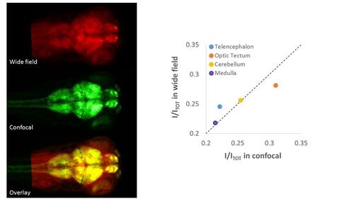 Evaluation of cross-talk between brain regions due to wide-field imaging. Imaging was performed on the same larva in wide field (left, top panel) and confocal (left, middle panel). The confocal image was constructed as the sum of 183 confocal planes (with 2 μm z-steps) encompassing the whole depth of the larva brain. This reconstruction is taken as a good reference for comparison with the wide field image, since each plane does not suffer from contributions of out-of-focus planes from adjacent brain regions at different depths. Comparison of the two images and observation of the overlay (left, bottom panel) demonstrates that the wide field image captures most of the relevant features of the encephalon as imaged with confocal microscope. A quantitative correlation between wide-field versus confocal intensities of the four regions analysed in the paper is shown in the right panel. Intensities are reported as percentage over the total intensity integrated on the whole brain. |