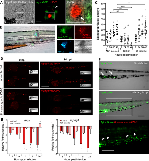 Acute, but not persistent infection results in systemic phagocyte death. (A) Sudan black staining of an mpx:GFP embryo (24 hpi), injected with ~45 CFU B. cenocepacia K56-2. Bright field, fluorescence and merged images showing recruited neutrophils (green) that release granules (stained by Sudan black as black deposit, white arrow) close to an infected cell containing red fluorescent bacteria. Arrow head, individual bacteria. Scale bars, 50 μm. (B) Image of the trunk region of an mpx:GFP; mpeg1:mCherry embryo 24 h post iv injection in the blood island with B. cenocepacia K56-2 (Turquoise), showing neutrophils (green) and macrophages (red) infiltrated in an infection site with multiple infected cells. BF, Bright field image, showing tissue damage. Scale bar, 50 μm. (C) Mean neutrophil numbers in non-infected control and mpx:GFP embryos injected at 50 hpf with B. cenocepacia K56-2 or B. stabilis LMG14294. See also S5B Fig and S5C Fig. (D) Mpeg1:mCherry embryos showing reduced macrophage numbers (red) at 24 hpi in B. cenocepacia K56-2-infected (~45 CFU) compared to non-infected control embryos. Scale bars, 0.5 mm. See S5D Fig for quantification. (E) Mean relative mpx and mpeg1 gene expression level (qRT-PCR) in embryos injected with on average 234 CFU of B. cenocepacia K56-2 (red bars) or 123 CFU of B. stabilis LMG14294 (pink bars) each normalised to a PBS-injected control group at each time point and analysed using Anova (error bars, SEM). Two independent experiments. Asterisks below each bar indicate significance compared to the PBS control at each time point, significance between groups per time point is indicated with a horizontal line. (F) Non-infected and B. cenocepacia K56-2 (~50 CFU, Turquoise indicated in red for better visualization) infected embryos at 24hpi with the cell-impermeable dye Sytox Green. Arrows, dead cells due to DMSO injection. Arrow heads, bacterial clusters. Scale bars, 100 μm. See also S5F Fig. (C). Each data point represents an individual embryo. (C,E) * p ≤ 0.05; ** p ≤ 0.01; *** p ≤ 0.001; **** p ≤ 0.0001; ns: non-significant. See materials and methods for statistical tests. See also S5 Fig. |