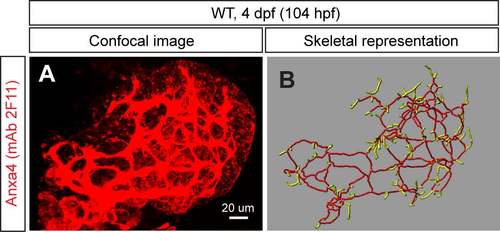 The skeletal analysis worked with the anti-Anxa4 (mAb 2F11) staining data. (A) Projected confocal image of the wild-type liver visualized for Anxa4 expression by mAb 2F11 staining at 104 hpf. (B) Skeletal representations of the intrahepatic biliary network computed based on Anxa4 expression in (A). The liver analysis program developed in this study can analyze the anti-Anxa4 staining data. Ventral views, anterior to the top. |