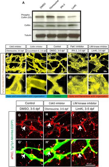 The Cdk5-mediated kinase cascade regulates F-actin cytoskeletal organization. (A) Cofilin phosphorylation levels at serine 3 (S3) in wild-type larvae treated with DMSO, olomoucine, IPA-3 or LimKi and analyzed by western blotting. Olomoucine treatment increased Cofilin S3 phosphorylation, thus inhibiting its activity. IPA-3 and LimKi treatment suppressed Cofilin S3 phosphorylation, activating its activity. Total Cofilin protein levels remained constant. Tubulin blotting provided a loading control. These experiments were repeated three times with similar results. (B-F) Projected colocalization signal images computed based on Tg(Tp1-MmHbb:EGFP)um14 expression and phalloidin to visualize the actin network in biliary epithelial cells at 5 dpf in larvae treated as indicated. Compared with the control, F-actin appeared to be localized around the lumen in olomoucine-treated and cucurbitacin E-treated larvae, whereas it showed spiky and filamentous organization in IPA-3-treated and LimKi-treated larvae. Boxed regions in B-F are magnified in B′-F′. (G-I) Projected images of 15 μm-thick confocal z-stacks of the liver in larvae treated as indicated and visualized for apical membrane marker aPKC (red) expression at 5 dpf. (G′-I′) aPKC expression merged with Tg(Tp1-MmHbb:EGFP)um14 (green) expression. At 5 dpf, aPKC showed restricted expression in bile canaliculi (asterisks), which are the apical membranes of hepatocytes, and in the apical membranes of biliary epithelial cells (arrows) in control larvae. This expression was unchanged by olomoucine or LimKi treatment. These data suggest that Cdk5 or LimK inhibitors do not influence the apicobasal polarization of biliary epithelial cells. |