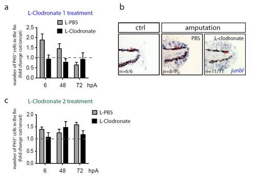 Depletion of macrophages using L-Clodronate injections in early stages but not late stages of regeneration impairs blastema formation. (a and c) Blastema cell proliferation at 6, 48 and 72 hpA after L-clodronate 1 (a) and Lclodronate 2 (c) treatments in indicated conditions. Mitotic cells were detected using an anti-phosphorylated histone H3 (PH3) antibody (Nlarvae = 4-6 per group, average value of cut/uncut ratio ± s.e.m, differences are not significant). (b) junbl mRNA expression (blue), as shown by in situ hybridization, in non-amputated fin or 6 hpA, in Tg(mpeg1:mCherry-F) larvae that were previously injected with PBS or L-clodronate 24 hours before amputation. |