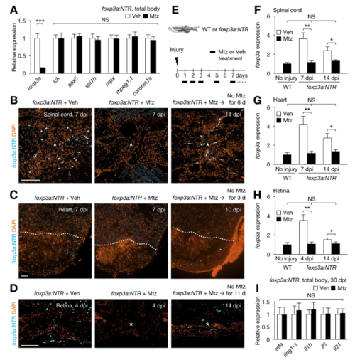 Inducible ablation of zTreg cells, Related to Figure 4. (A) foxp3a:NTR fish were treated overnight on 3 consecutive days with vehicle (Veh) or metronidazole (Mtz), and total fish samples were used for qRT-PCR analysis of lck (T cells), pax5 (B cells), spi1b (myeloid cells), mpx (neutrophils), and mpeg1.1 and coronin1a (macrophages) (mean ± SEM, n = 5). Exposure of foxp3a:NTR fish to Mtz reduced endogenous foxp3a expression by approximately 85%, without altering the expression of other immune cell markers. Gene expression is shown relative to the levels in vehicle controls. (B) foxp3a:NTR fish were injured at the spinal cord and treated overnight with Veh (left) or Mtz (middle and right) at 1, 2, 3 and 5 dpi. The spinal cords were analyzed via immunofluorescence against TagCFP at 7 dpi (left and middle) and 14 dpi (right; after an 8-day interval without Mtz treatment). Asterisk, injury epicenter. (C) foxp3a:NTR fish were injured at the cardiac ventricle and treated overnight with Veh (left) or Mtz (middle and right) at 4, 5, and 6 dpi. The hearts were analyzed at 7 dpi (left and middle) and 10 dpi (right; after a 3-day interval without Mtz). Dotted line, wound border. (D) foxp3a:NTR fish were injured at the retina and treated overnight with Veh (left) or Mtz (middle and right) at 1, 2, and 3 dpi. The retinas were analyzed at 4 dpi (left and middle) and 14 dpi (right; after a 11-day interval without Mtz treatment). Asterisk, injury epicenter. (E) zTreg cell ablation protocol used throughout this study. After 7 days, Mtz or Veh treatments were performed every second day for the duration of the experiment. (F–H) Clutch mate WT and foxp3a:NTR fish were subjected to injury and drug treatments as described in (E), and foxp3a expression in the spinal cord (F), heart (G), and retina (H) was measured by qRT-PCR (mean ± SEM, n = 5). (I) qRT-PCR analysis of inflammatory cytokine genes in foxp3a:NTR fish after a 30- day treatment regimen as described in E (mean ± SEM, n = 5). dpt, days post treatment. Single confocal sections are shown in B-D. DAPI: 4',6-diamidino-2- phenylindole. *P < 0.05, **P < 0.01, ***P < 0.001, Mann–Whitney U test. NS, not significant. Scale bars, 50 μm. |