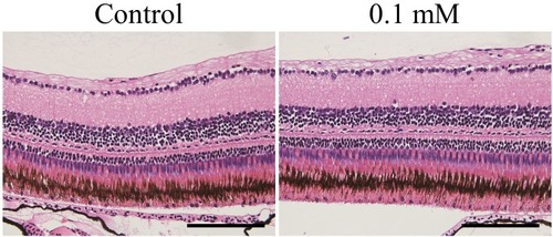 Representative images of H&E staining of adult zebrafish retinas after sodium iodate exposure at 0.1 mM for 30 days. No significant differences were observed between the control group and the treatment group. Scale bars indicate 100 µm. |